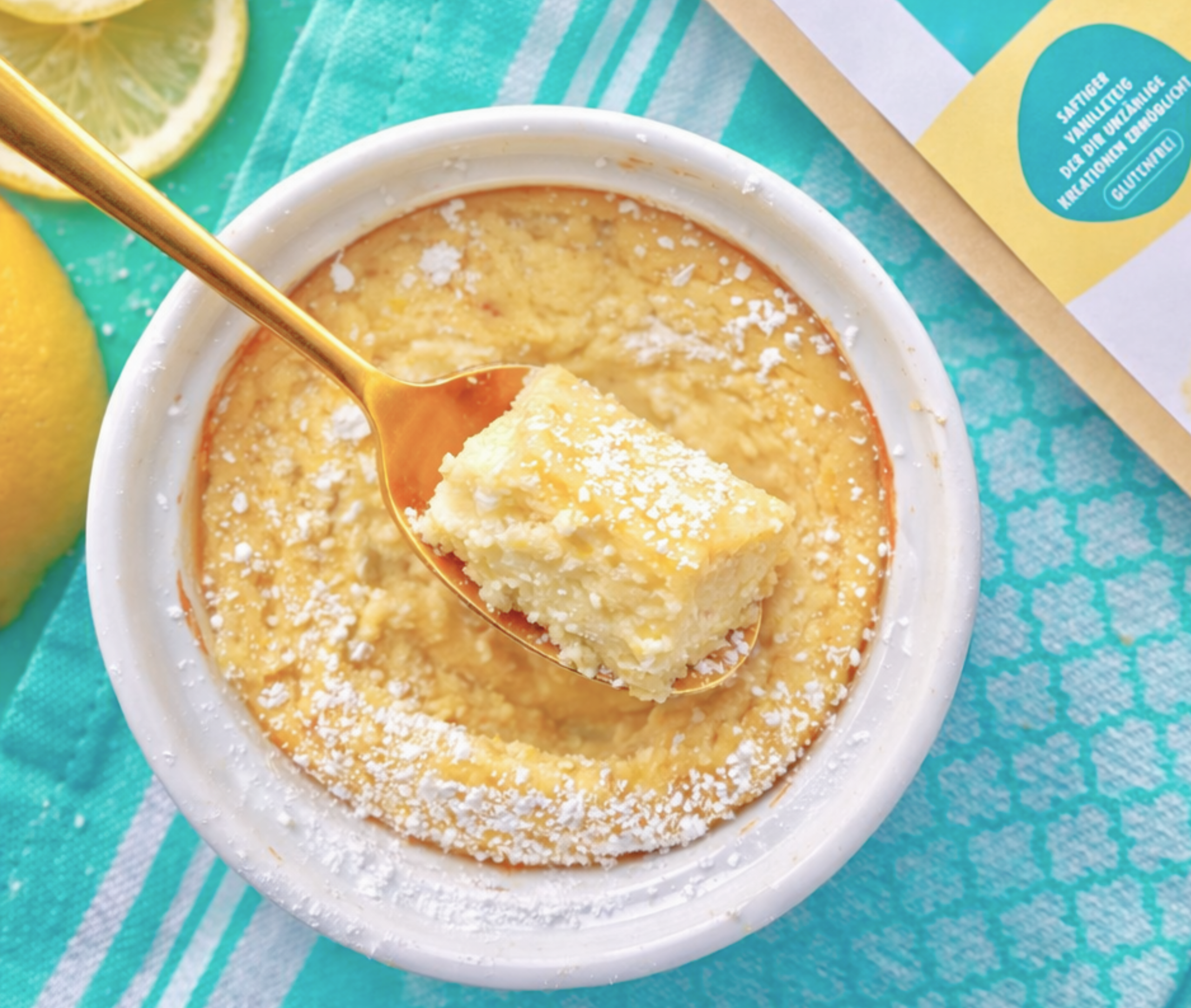 - Den Vanille-Teig nach Packungsanweisung zubereiten (mit Quark, Wasser und optional einer zusätzlichen Süße vermengen) und in ein kleines backofenfestes Gefäß füllen.