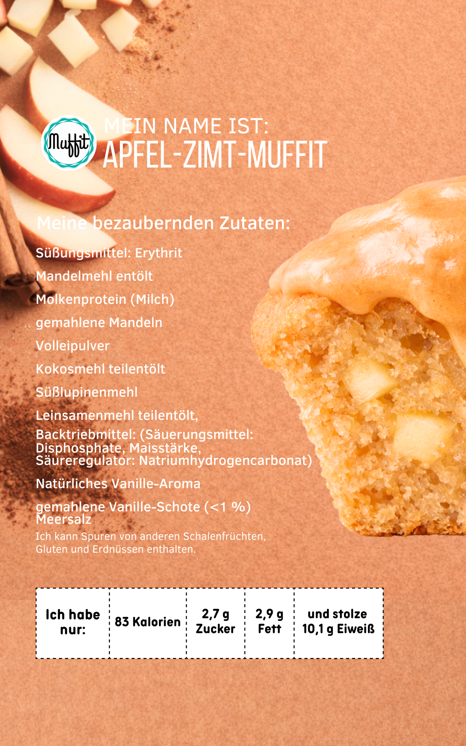 Süßungsmittel: Erythrit, Molkenprotein (Milch), Mandelmehl entölt, Kokosmehl teilentölt, Süßlupinenmehl, Volleipulver, Apfelwürfel gefriergetrocknet (8 %), Leinsamenmehl, Backpulver (Säuerungsmittel: Disphosphate; Backtriebmittel: Natriumhydrogencarbonat; Maisstärke), Zimt (3 %), Meersalz. Kann Spuren von anderen Schaltenfrüchten, Gluten und Erdnüssen enthalten.