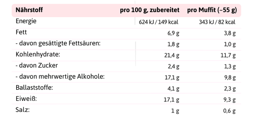 Süßungsmittel: Erythrit, Molkenprotein (Milch), Mandelmehl entölt, Volleipulver, Kokosmehl teilentölt, Süßlupinenemehl, Leinsamenmehl teilentölt, gemahlene Mandeln, Backpulver (Säuerungsmittel: Disphosphate; Backtriebmittel: Natriumhydrogencarbonat; Maisstärke), natürliches Vanillearoma, gemahlene Vanilleschote, Meersalz.