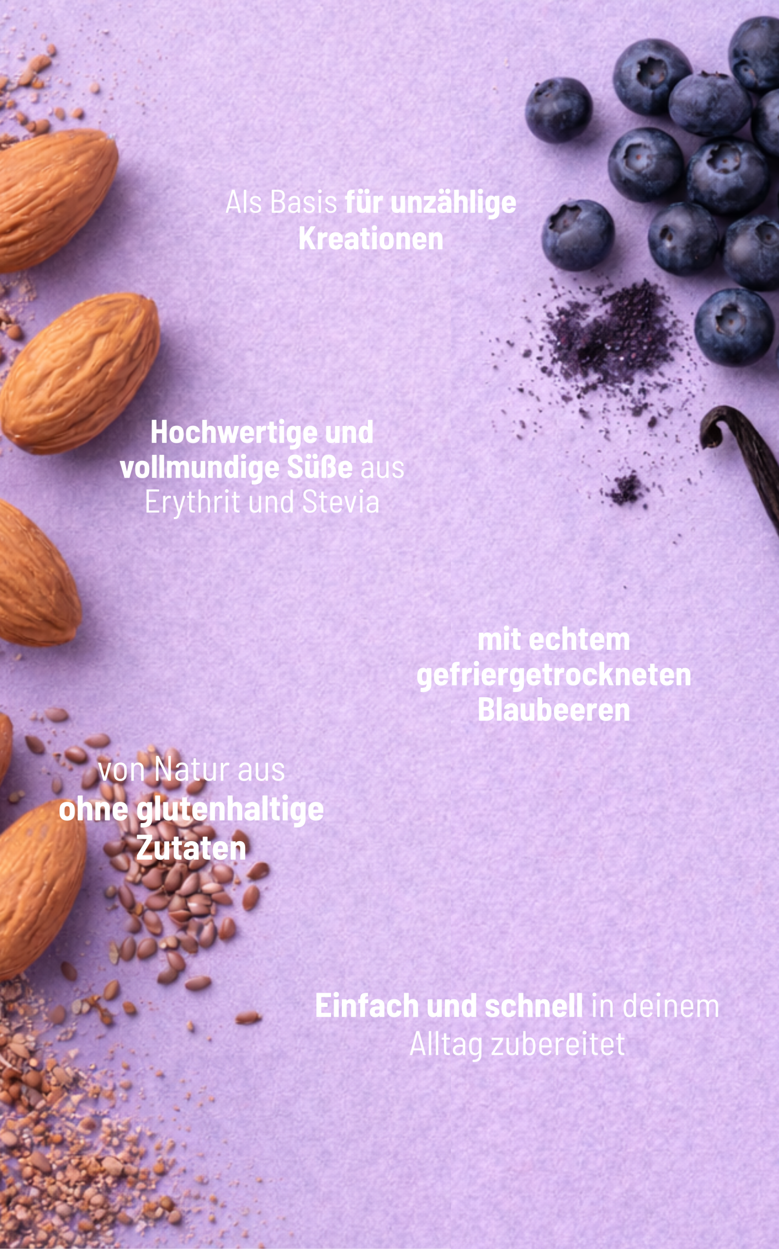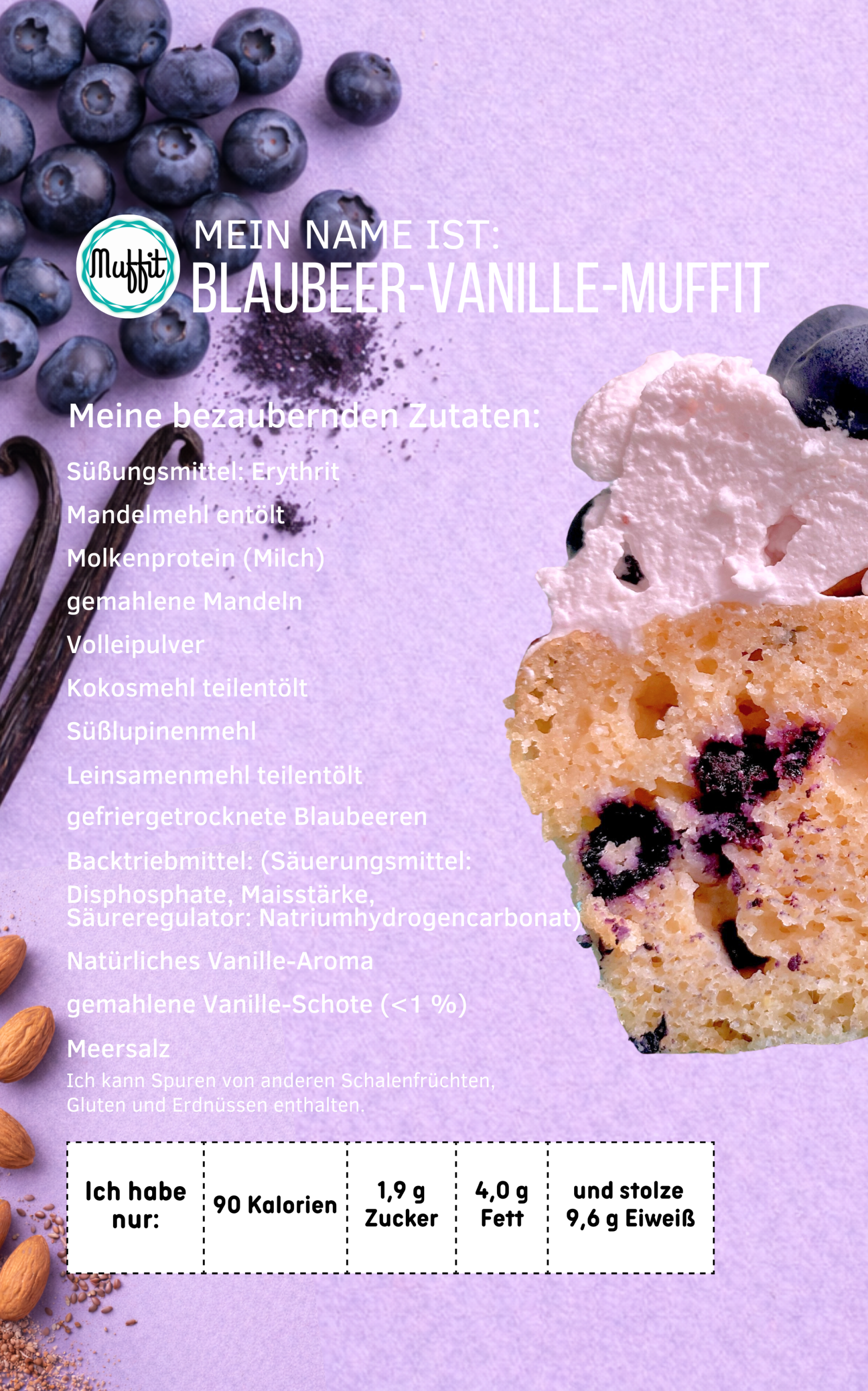 Süßungsmittel: Erythrit, Molkenprotein (Milch), Mandelmehl entölt, Volleipulver, Süßlupinenmehl, Kokosmehl teilentölt, Blaubeeren gefriergetrocknet (8 %), Leinsamenmehl hell, natürliche Aromen, Backtriebmittel: Säuerungsmittel: Disphosphate; Backtriebmittel: Natriumhydrogencarbonat; Maisstärke), gemahlene Vanille, Meersalz, Stevioglycoside. Kann Spuren von anderen Schaltenfrüchten, Gluten und Erdnüssen enthalten.