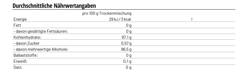 Süßungsmittel: Erythrit, gefriergetrocknete Himbeeren, färbendes Lebensmittel aus Süßkartoffel, Rettich, Kirsche und Apfel, natürliches Aroma, Süßungsmittel: Steviolglykoside.